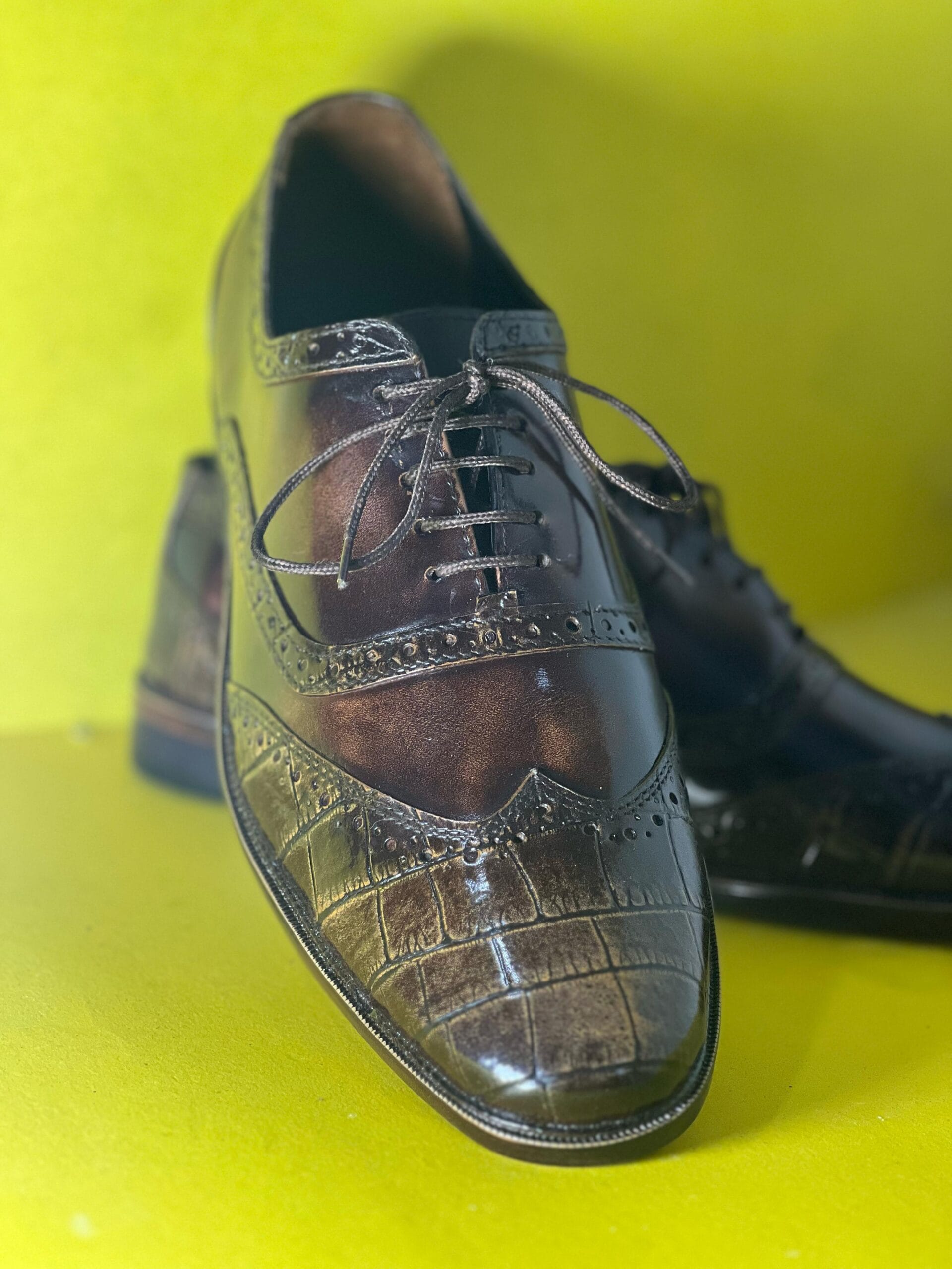Elevate your style with the Impero Brown, a true masterpiece of elegance and craftsmanship. Crafted from premium cow leather, this luxury Oxford shoe features a rich, hand-polished brown finish that exudes sophistication. The exquisite brogue detailing seamlessly blends with the embossed alligator-textured leather, adding depth and character to its design.
