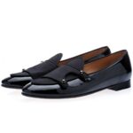 BLACK SUPERIOR PATENT CALFSKIN DOUBLE-MONK BELGIAN LOAFERS WITH MATCHING SATIN DETAILS, GROS-GRAIN PIPING AND ROUND RHINESTONE BUTTONS. THIS FINE STYLE IS PART OF THE “CELEBRATE WITH HOE HUB” CAPSULE COLLECTION,