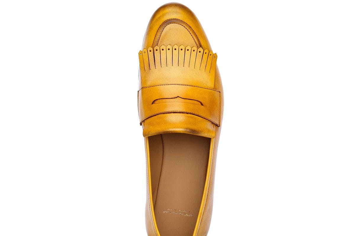 yellow hand-brushed calfskin loafers with fringes.
