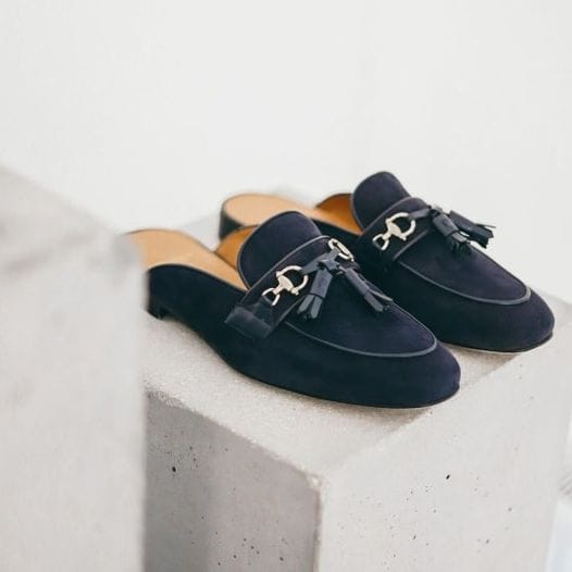 NAVY BLUE SUEDE MULES WITH MATCHING NAVY BLUE CLAFSKIN PIPING AND TASSELS AND METAL HORSEBITS IN ANTIQUE GOLD FINISHING. THIS BRAND NEW DESIGN OPENS UP TO THE NEW BRUNO STYLE CHARACTERIZED BY ELEGANT METALLIC DETAILS AND KNOTTED TASSELS IN SILKY CALFSKIN