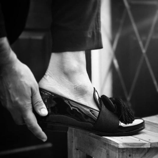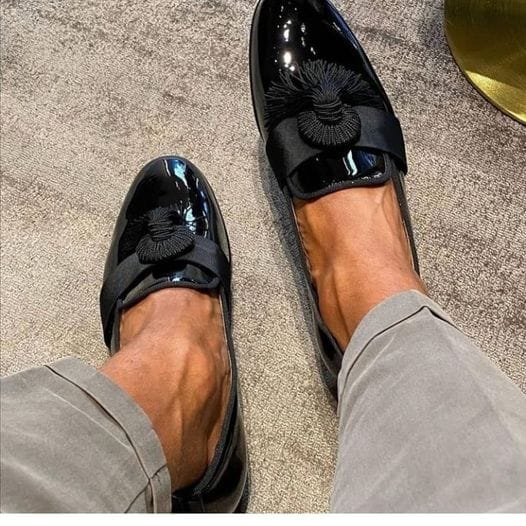 black superior patent calfskin slippers with ottoman-inspired fringed embellishments on ton-sur-ton gros-grain bands. this fine style is part of the “celebrate with shoe hub” capsule collection,